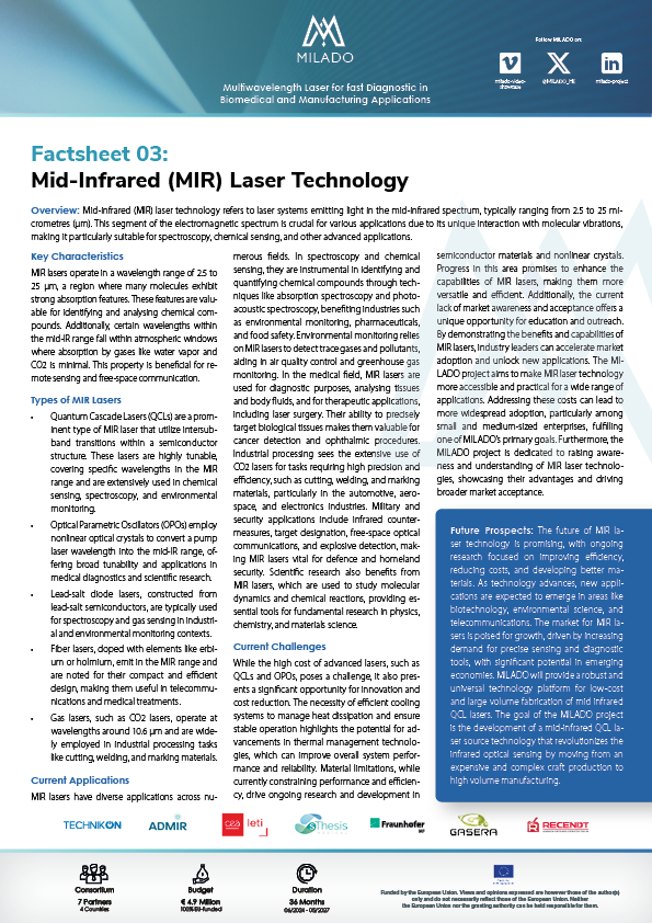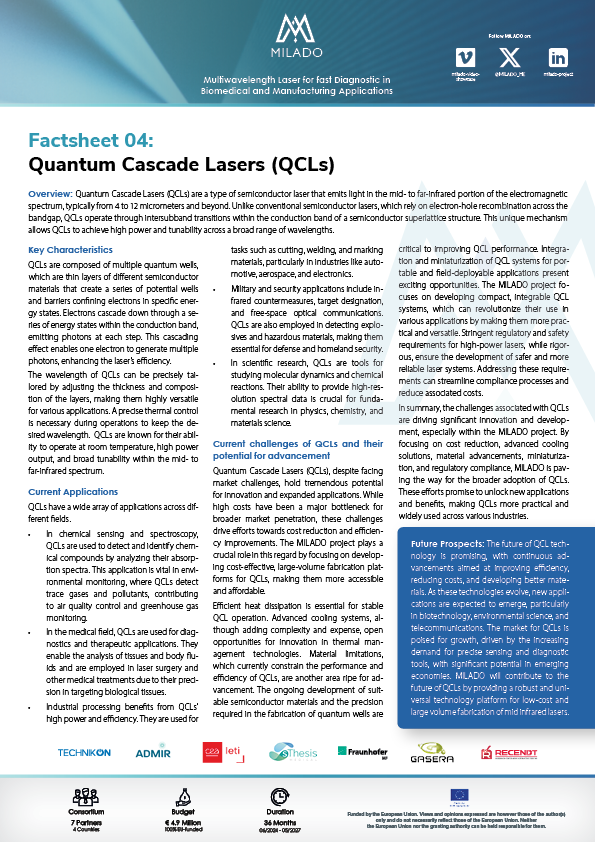 The Horizon Europe project MILADO explores Quantum Cascade Lasers (QCLs), a type of semiconductor laser that emits light in the mid- to far-infrared region of the electromagnetic spectrum, typically from 4 to 12 micrometres and beyond. Unlike conventional semiconductor lasers,...